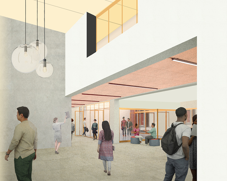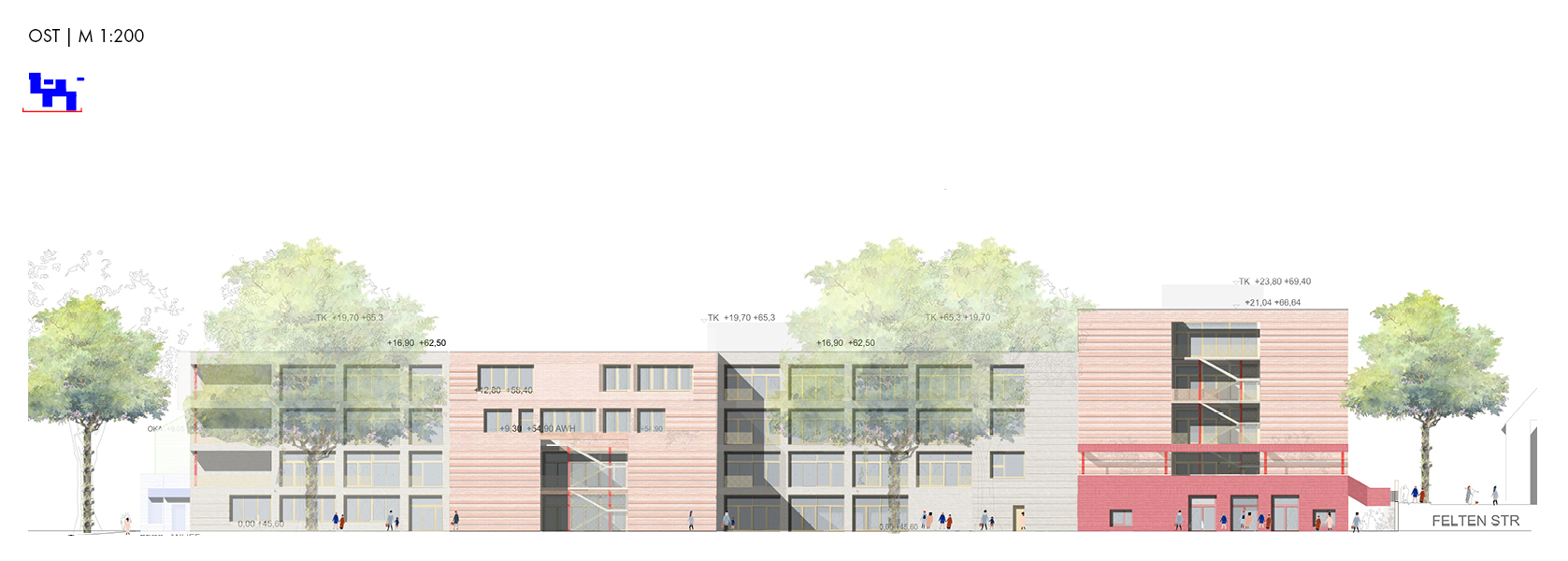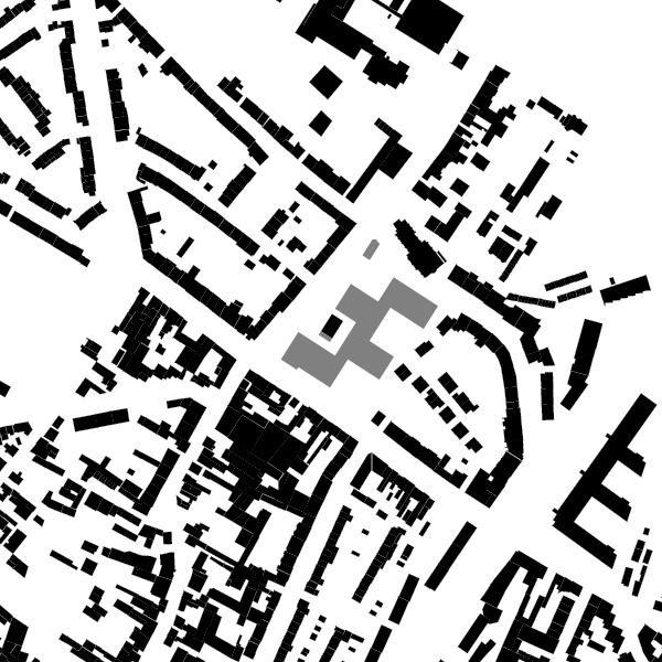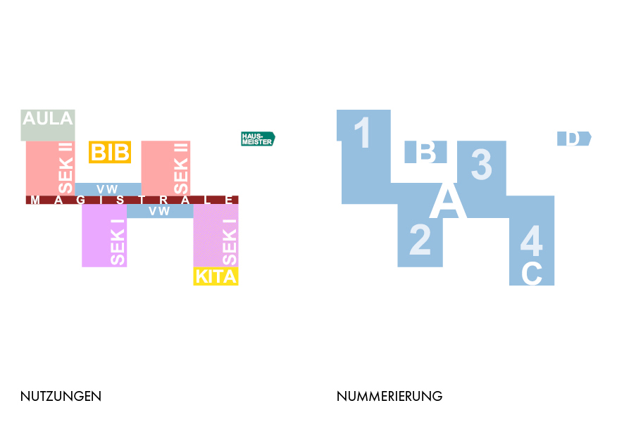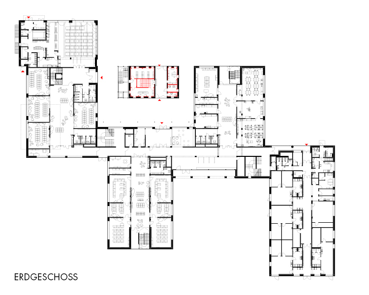 Der Entwurf reagiert auf das heterogene Umfeld mit einer schachbrettartigen Struktur aus vier Baukörpern entlang einer zentralen Magistrale.