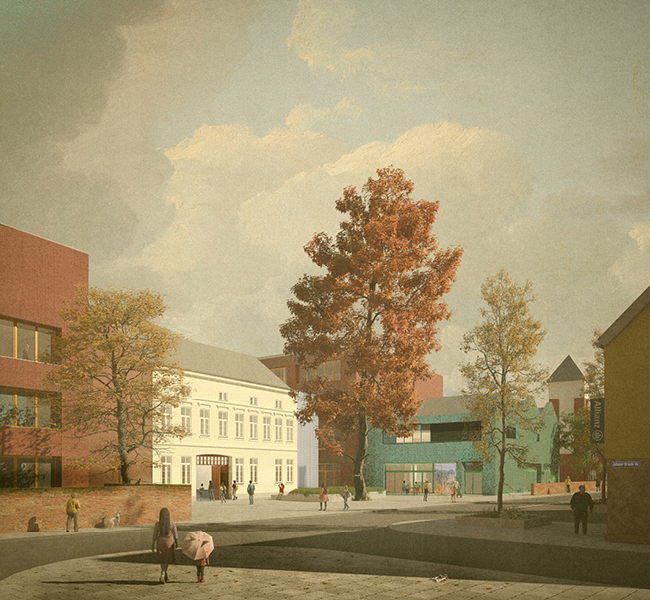 Diese verbindet Schule, Kita und das denkmalgeschützte Herrenhaus, welches zur Bibliothek umgenutzt und zum identitätsstiftenden Zentrum des Ensembles wird.
