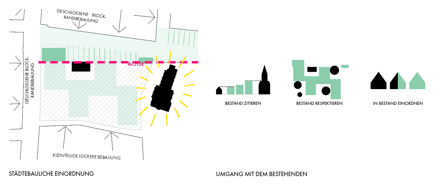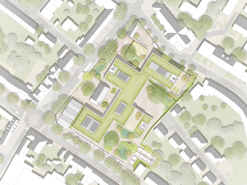 Das Konzept verbindet einen Schulbau mit Denkmalschutz, Städtebau, und Landschaftsarchitektur zu einem ökologisch wie pädagogisch vorbildlichen Lernort.