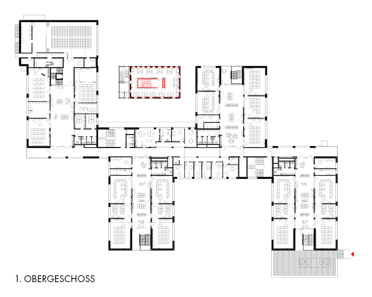 Er bildet damit das kulturelle Zentrum der Schule und wird durch ein gefaltetes Dach architektonisch hervorgehoben.